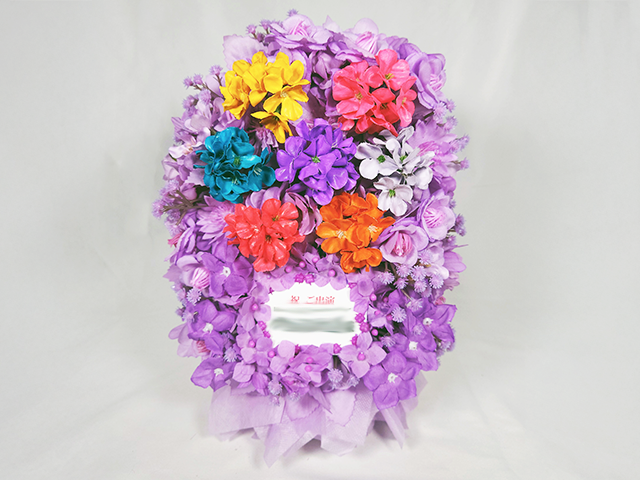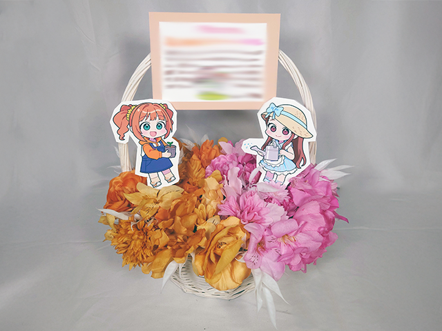 手付きカゴの2色濃淡アレンジ 特注制作 2025.11.01◆手付きカゴの2色濃淡アレンジベースタイプ:特注制作・手付きカゴ(全体40㎝) ベースカラー:オレンジ濃淡プラスカラー:ピンク濃淡・白お祝い札・キャラパネル:データ持込み・当店印刷□参考価格:18,000円