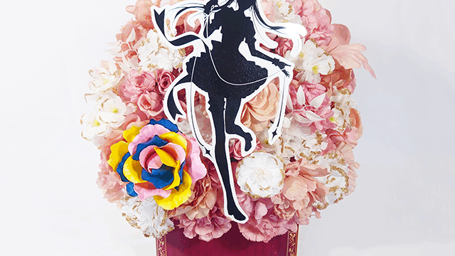 楽屋花アレンジ/5色の色分けアレンジ+フリル装飾/Yatsugi Flower Dye Lab(八ツ木フラワーダイラボ)